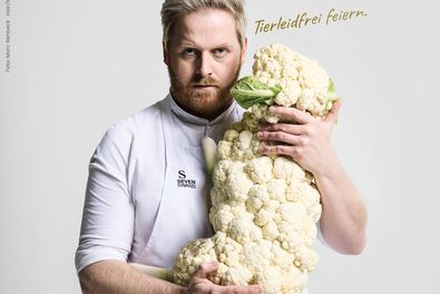 Mit einer Osterkampagne macht der Frankfurter Sternekoch Ricky Saward auf das Leid von Tieren aufmerksam und plädiert für ein veganes Fest: Auf einem neuen PETA-Motiv hält er ein Lamm im Arm – geformt aus Blumenkohl.