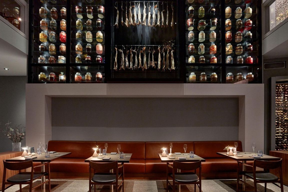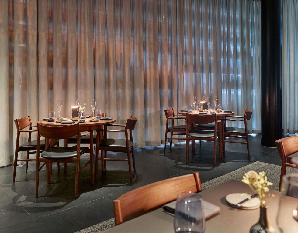 Der Dialog zwischen Koch und Gästen ist an einem Stehtisch gegenüber dem Küchenpass verortet. Hier können Gäste einen Gang im Stehen einnehmen und die Küchenmannschaft in Aktion erleben. Themen wie Regionalität, Nachhaltigkeit, Sinn für Details und Handwerklichkeit, aber auch ein sehr hohes Maß an ästhetischer Kraftspielen in der Küche von Marco Müller eine große Rolle und finden sich im Interieur wieder. So wurden Holzelemente nach eigenen Entwürfen in Handarbeit aus Nussbaum gefertigt, Sitzbänke mit hochwertigem Leder bezogen und der vorhandene Schieferboden aufbereitet.