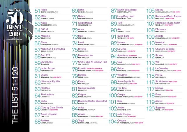 Die erweiterte Liste der The World's 50 Best Restaurants ist in diesem Jahr erstmals um 20 Plätze auf nun 120 Restaurants ausgedehnt worden.