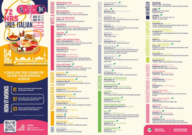 Italienische Küche, das ist mehr als Spaghetti und Pizza. Ob sizilianische Caponata, apulische Focaccia, venezianische Cicchetti oder Arrosticini aus Umbrien - 54 ausgewählte Restaurants in Berlin zeigen von Mittwoch (22. Mai) bis Samstag beim Festival «72 hrs True Italian Food», was sie so alles zu bieten haben.