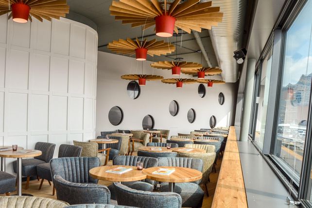 Das „Alex Hamburg Überseebrücke“ wird auf zwei Ebenen eine Gastraumfläche von rund 300 Quadratmetern bieten. Direkt von der Elbpromenade ist der ebenerdige Zugang zur Promenadenebene mit ca. 70 Innen- und 160 Außen-Sitzplätzen möglich. Bei schönem Wetter lässt sich die Glasfassade öffnen. Ausblicke auf die Elbe und die Elbphilharmonie beschert zudem das Obergeschoss mit seinen bodentiefen Schiebeglaselementen. Offen ist auch die Küche, in der die Speisen vor den Augen der Gäste zubereitet werden.