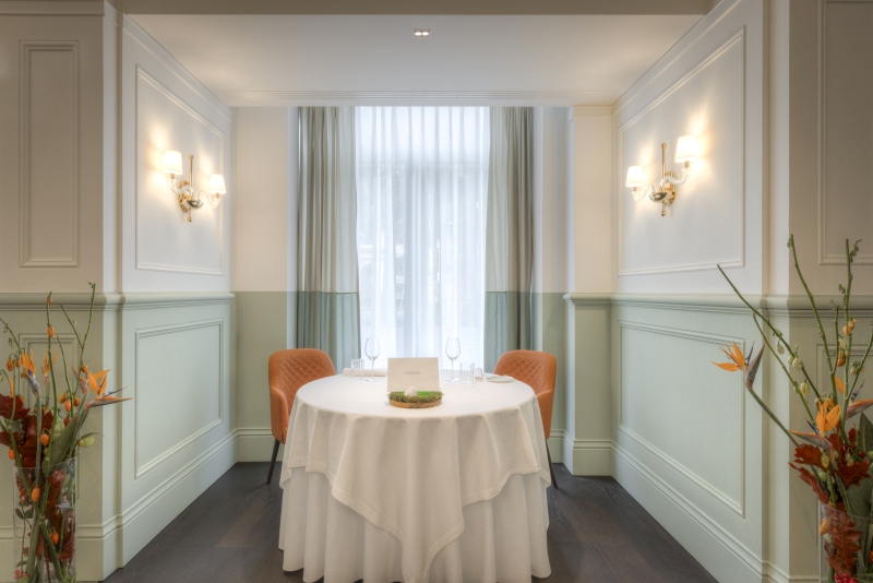 Bewusst erhalten blieben historische Elemente wie der Stuck, um Tradition mit moderner Eleganz zu verbinden. Funktionale und nachhaltige Komponenten ergänzen das Design: Dazu gehören handgefertigte Wassergläser des Wiener Studio Comploj, Handtaschenhocker aus Kork der Marke VITRA sowie Kunstinstallationen von Wildes Moos, einem Expertenbüro für Vertikalbegrünung, welche den naturverbundenen Anspruch des Hauses unterstreichen.