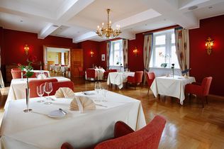 Neben dem Menü stehen auf der Karte immer auch ein Schmorgericht und ein großes Fleischstück zum Teilen, wie am Knochen trockengereiftes Porterhouse-Steak; saisonal gibt es Wild oder Fische aus dem Rhein. Seine Gerichte sind nicht in erster Linie instagramable, sondern sollen den Eigengeschmack der Zutaten transportieren: „Ich bin kein Freund von Schäumchen, Sphären und Gels.“ Klassisch-französische Küche mit weltoffen-modernen Nuancen und zeitgemäßer Anrichteweise – das passe zu Baden und zum herrschaftlichen Ambiente mit Kronleuchter, roten Stofftapeten und Silberbesteck.
