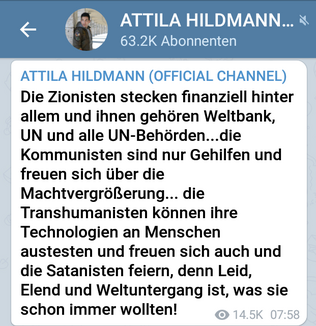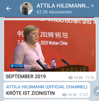 Nachdem sich Hildmann zu Beginn noch auf Bill Gates fokussierte, rückten in den vergangenen Wochen auch Angela Merkel und eine vermeintliche „zionistische Weltverschwörung“ in seinen Fokus. Merkel, die von Hildmann ausnahmslos als „Kröte“ diffamiert wird, sei in Wahrheit eine Zionistin und die Rache für das dritte Reich. Zudem würden die Zionisten hinter allem stecken, die Weltbank sowie alle UN-Behörden kontrollieren.