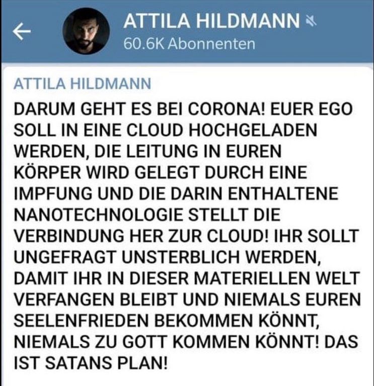 Anfang Juni schrieb er auf seinem Telegram-Kanal, dass er nun wüsste, worum es bei Corona gehe: „Euer Ego soll in eine Cloud hochgeladen werden, die Leitung in Euren Körper wird gelegt durch eine Impfung und die darin enthaltene Nanotechnologie stellt die Verbindung her zu Cloud. Ihr sollt ungefragt unsterblich werden (…) das ist Satans Plan“, so Hildmann. Wenige Wochen zuvor war er allerdings noch davon überzeugt, dass die Weltbevölkerung von dunklen Mächten auf 500 Millionen Menschen reduziert werden soll.
