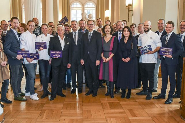 Der Regierende Bürgermeister von Berlin, Michael Müller, hat am 7. November 2019 einige der renommiertesten Köchinnen und Köche der Berliner Spitzengastronomie im Roten Rathaus empfangen. Zusammen mit Christian Andresen, Präsident des Dehoga Berlin, Thomas Lengfelder, Hauptgeschäftsführer des Dehoga Berlin und Bernhard Moser, Impulsgeber Dehoga Berlin flagship und Vorsitzender der Gruppe, hat er den teilnehmenden Gastronomen zur Aufnahme die Plakette übergeben, die sie als Mitglied der fine-dining Gruppe Dehoga Berlin flagship auszeichnet.