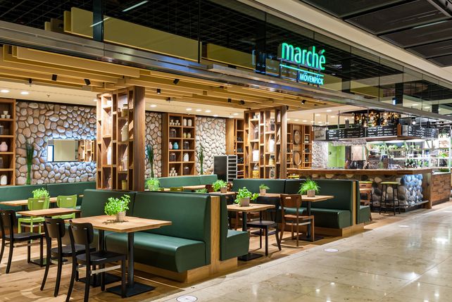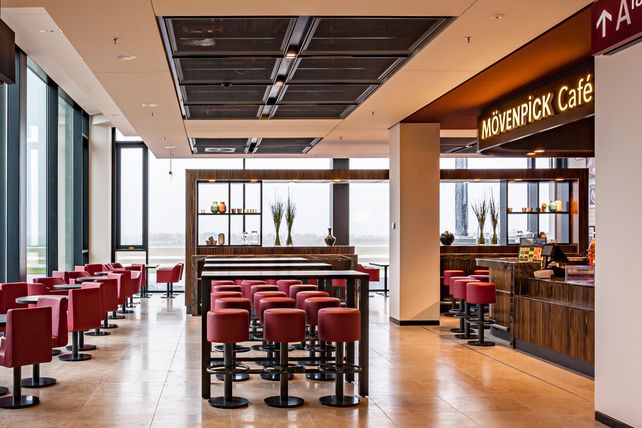 Neben der Sandwich Manufaktur hat Marché International noch einen weiteren Laden am neuen Flughafen eröffnet: Das Mövenpick Café im Abflugbereich bei den Gates mit rund 110 Sitzplätzen. Dort liegt der Fokus verschiedenen Kaffeespezialitäten. Ein Beispiel sind die Bio/Fairtrade Kaffeebohnen, welche aus den Hochlandregionen der ganzen Welt kommen.