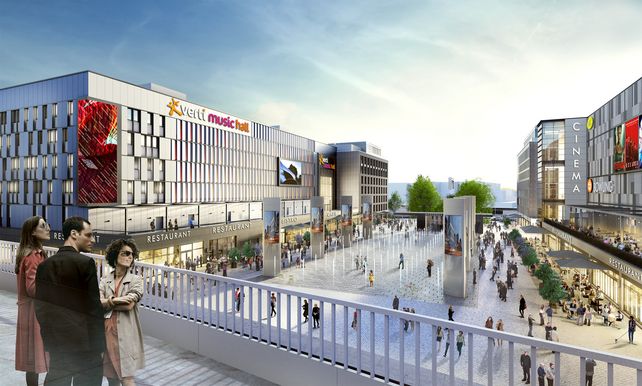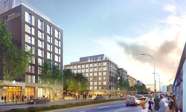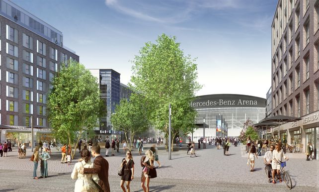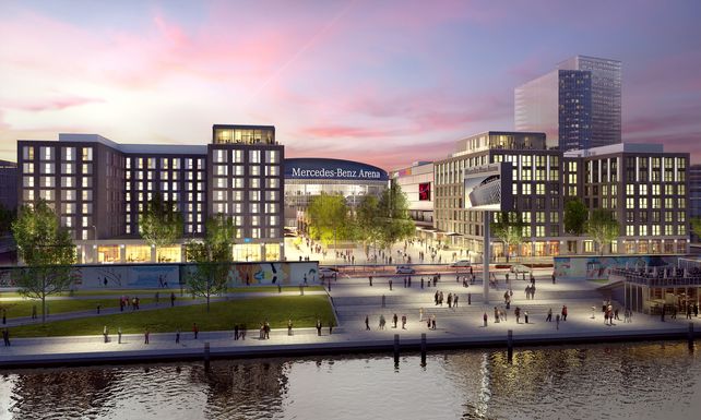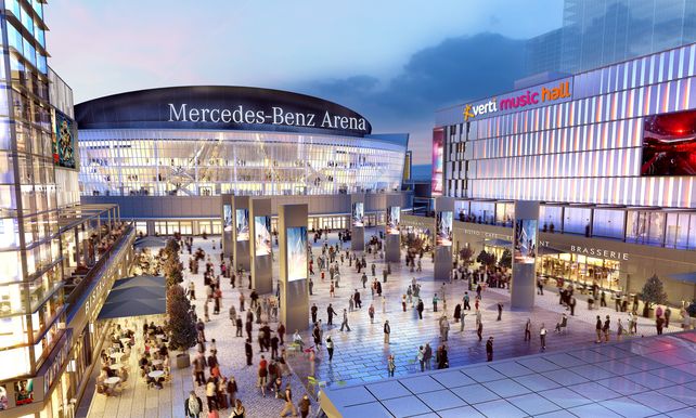Vor der Mercedes-Benz Arena entwickelte die Anschutz Entertainment Group bis Oktober 2018 für rund 200 Millionen Euro den Mercedes Platz - das Herzstück für das dynamisch wachsende Stadtquartier entlang der East-Side-Gallery. Teil des Areals sind die Verti Music Hall für circa 4.350 Besucher, ein UCI LUXE Kino mit 1.700 Plätzen, eine Lifestyle Bowling Lounge der Marke Bowling World mit 28 Bahnen sowie rund 20 Cafés, Restaurants und Bars. Hinzu kommen zwei Hotels - ein Indigo Design Hotel mit rund 118 Zimmern und ein Hampton by Hilton mit 254 Zimmern - sowie circa 10.000 Quadratmeter Büroflächen.