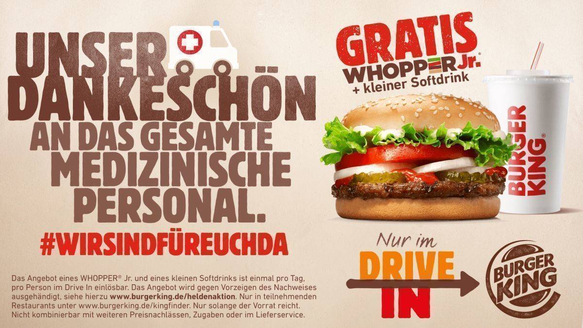 Auch Burger King reagiert auf die Corona-Krise und lädt Berufstätige im Gesundheitswesen zu einem Whopper Jr. mit kleinem Softgetränk am Drive In ein. Mit dieser Aktion und unter dem Motto „Helden Menü – Ihr helft, wir geben!“ will sich das Unternehmen laut eigener Aussage dankbar für den Einsatz der Corona-Helden zeigen.