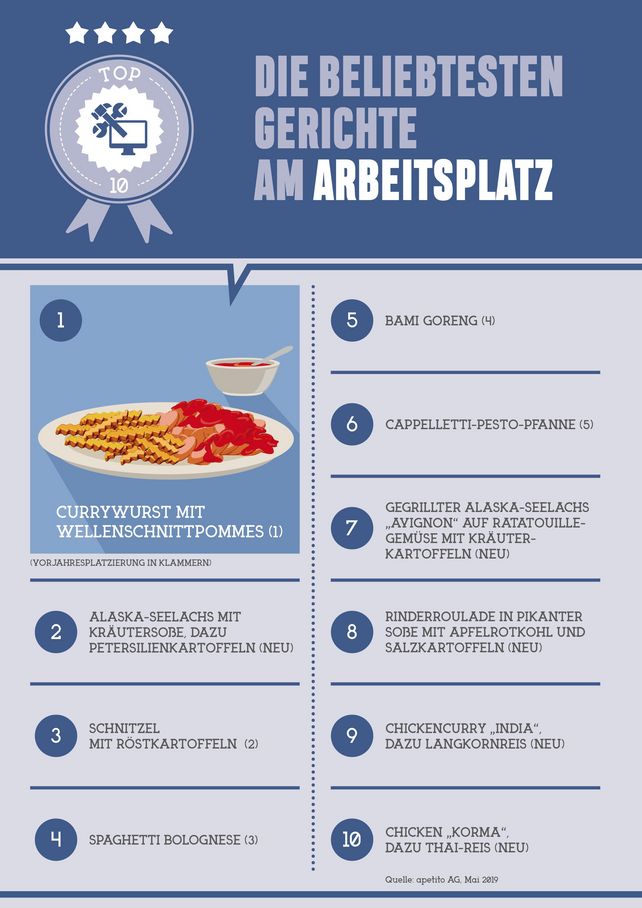 Bei den einzelnen Auswertungen im Bereich Kinder und Jugendliche, bei den Tischgästen in Betriebsrestaurants sowie bei den Senioren lässt sich zusammenfassen: Die Top-Plätze bleiben gleich, dahinter gibt es viel Bewegung. In Kindertagesstätten und Schulen konnte sich die Tomatensuppe wieder den Spitzenplatz sichern. Ungeschlagen und damit am beliebtesten am Arbeitsplatz bleibt die Currywurst mit Pommes. Auch die Senioren bleiben der Rinderroulade als ihrem klassischen Favoriten treu.