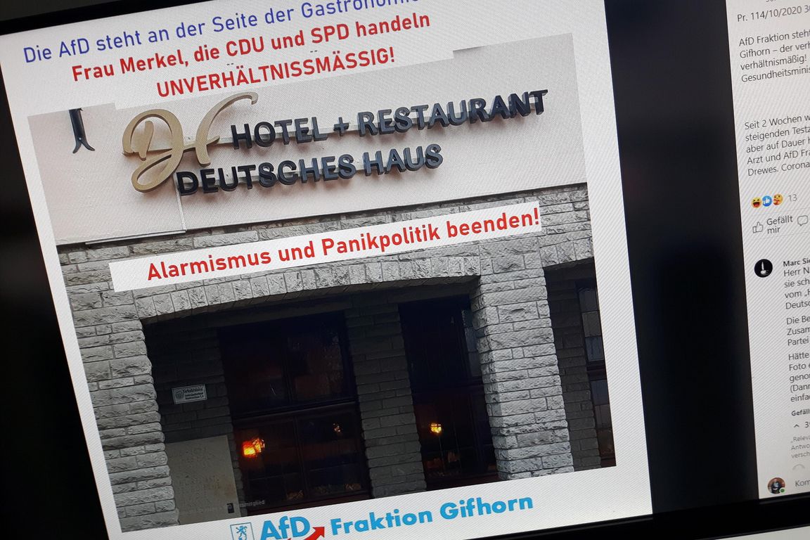 Die AfD in Gifhorn macht Stimmung gegen den bundesweiten Lockdown und gegen "Alarmismus und Panikpolitik" der Regierung. Dafür nutzte die Partei ein Foto des Deutschen Hauses und erklärte, dass die AfD an der Seite der Gastronomie stehe. Armin Schega-Emmerich, Inhaber des Traditionshauses, wehrt sich gegen dieses Vorgehen und schaltete bereits einen Anwalt ein.