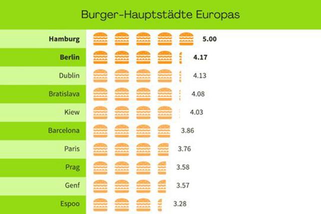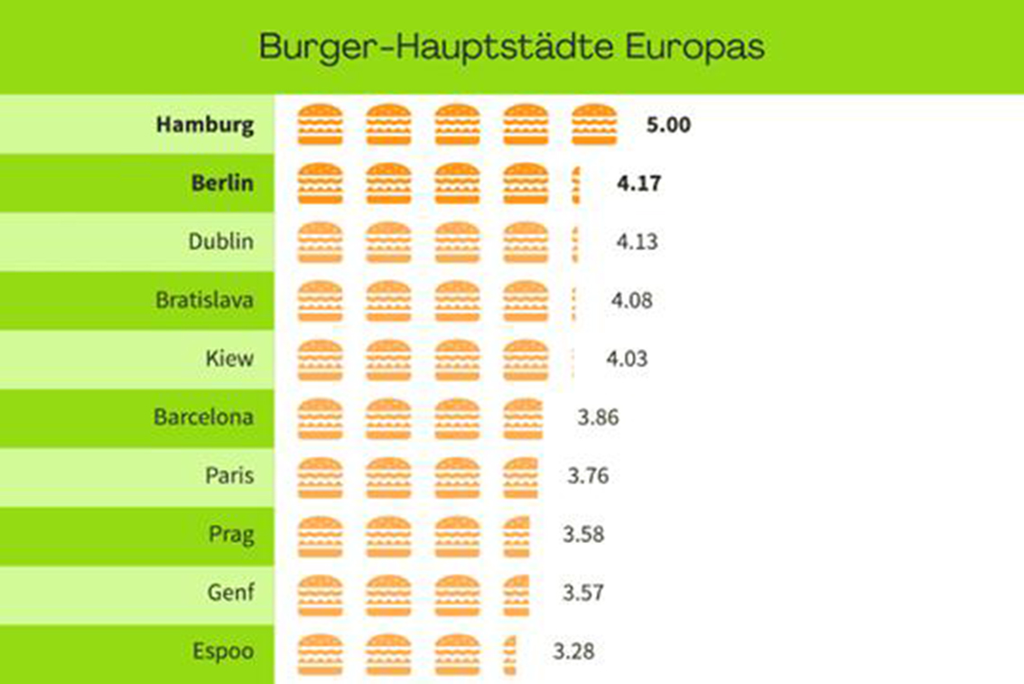 Die Hansestadt Hamburg kann sich verdient als Burger-Hauptstadt Europas bezeichnen. Mit einer besonders großen Auswahl an vegetarischen, veganen und klassischen Burger-Restaurants, die zudem die besten Bewertungen im Vergleich erhalten und finanziell vergleichsweise erschwinglich sind, hat Hamburg Berlin auf dem zweiten Platz hier einiges voraus. Der dritte Platz geht an Dublin, gefolgt von Bratislava und Kiew. Metropolen wie Barcelona, Paris oder London müssen sich dahinter einreihen.