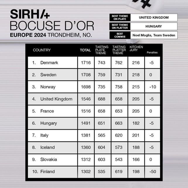 Außerdem sind die Mannschaften aus Großbritannien, Frankreich, Ungarn, Italien, Island, der Slowakei und Finnland für das Weltfinale in Lyon qualifiziert. Marvin Böhm aus den Restaurant Aqua in Wolfsburg und sein Commis Hannes Hensel hatten im letzten Herbst den deutschen Vorentscheid für den Kochwettbewerb Bocuse d´Or gewonnen. Somit vertrat der der Niedersachse zum dritten Mal Deutschland in dem internationalen Wettbewerb. Hier galt es ein Fleisch- und ein Fischgericht zubereitet werden. Das Fleischgericht wurde auf einer großen Platte präsentiert werden, das Fischgericht auf Tellern.