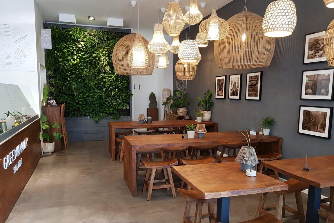 Dabei bedient Greenkarma alles andere als ein Nischenpublikum– im Gegenteil. Hier soll jeder nach seiner Façon satt werden, vom Veganer bis zum Fleischliebhaber. Dafür sorgen die großzügigen Portionen mit ausgewogenem Nährstoffgehalt. Ihr Ziel, aller Klischees zum Trotz, einen 40% männlichen Gastanteil zu begeistern, erreicht sie damit spielend. Karma kommt zurück, davon ist Nikki Lukas überzeugt und reiste für die Einrichtung eigens nach Bali, um dort bei lokalen Produzenten Hölzer, Lampenschirme und Möbel einzukaufen und unter fairen Bedingungen anfertigen zu lassen.