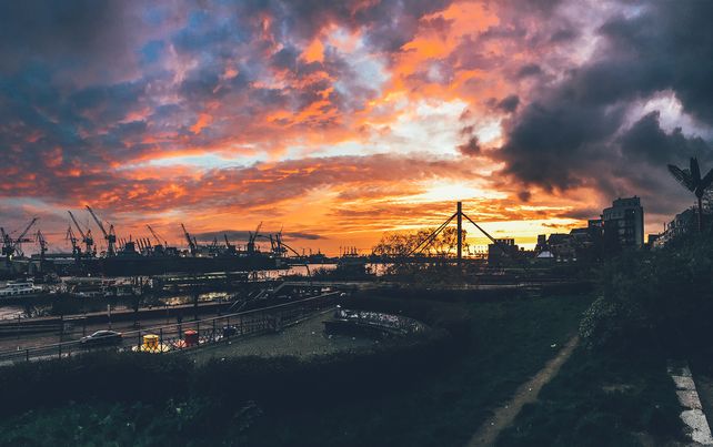 Auch beim Ambiente wird das Thema Fernweh großgeschrieben. Der Innenbereich erscheint als ein großer Marktplatz mit separatem Tasting-Room. Schwarze, verbrannte Holzbalken an der Decke wecken den Eindruck, in einem Schiffsbauch zu sitzen, grelle Leuchtstoffröhren erinnern an einen Trip nach Mexiko. Aber das Aushängeschild ist der überragende Blick auf den Hamburg Hafen, der im gesamten Restaurant sichtbar ist und durch einen großen Spiegel im vorderen Bereich des Restaurants so reflektiert wird, dass jeder Gast von überall aus durch das Tor zur Welt schauen kann.