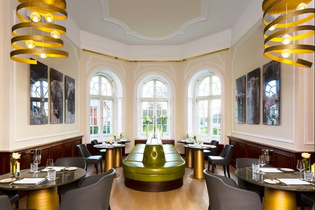 Innenarchitekt Olaf Kitzig über das Zusammenspiel von historisch und modern: „In den Räumen von 1842 fanden wir Stuck sowie eine authentische Feuerstelle vor. Sie konnten wie die Decke aus Tiffanyglas erhalten bleiben. So entsteht Spannung zwischen dem Baudenkmal und dem neuen Interior.”