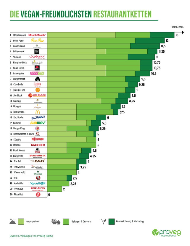 Klarer Sieger 2020 ist die japanische Nudelbar MoschMosch. Mit einer breiten Auswahl an Currys, Ramen, gebratenen Nudelgerichten und Co. sowie diversen rein pflanzlichen Vorspeisen und einem veganen Dessert liegt die Restaurantkette vorn. Ein Großteil der Grundgerichte bei MoschMosch ist vegan, die Gäste können dank diverser Toppings ihr Gericht nach eigenen Wünschen gestalten. Auf dem zweiten Platz landete Peter Pane. Das Unternehmen punkte laut ProVeg mit vielen veganen Speisen und biete Gästen am „Peter’s Meatless Monday“ alle Veggie-Burger zum vergünstigten Preis an. Bronze ging an das Fast-Casual-Konzept dean&david, das kürzlich seinen ersten vegan-vegetarischen Pilot-Store eröffnete.