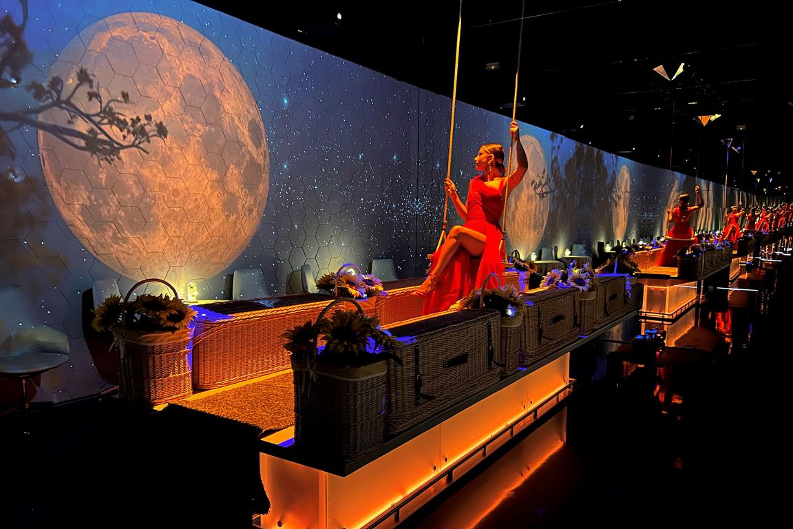 Jedes Dinner wird von einer Show begleitet. Diese umfasst 360-Grad-Projektoren, die auf jede Oberfläche, von den Wänden bis zum Tisch, Bilder malen. Die Hightech-Show verwandelt das Restaurant in eine Bühne, das Personal in Schauspielende und die Gäste in Stars.