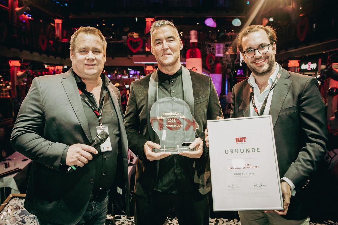 In diesem Jahr zeichnete BDT-Präsident Knut Walsleben Unternehmer Thomas Pieper mit dem begehrten Branchen-Award aus. Vor knapp 400 Fachbesuchern aus ganz Deutschland und Österreich hob Walsleben bei der Preisverleihung die herausragenden Leistungen von Pieper hervor: „Thomas Pieper behauptet sich seit über 30 Jahren überaus erfolgreich in der extrem schnelllebigen Nachtgastronomiebranche und setzt Maßstäbe“, erklärte Walsleben. Er lässt sich nicht von konjunkturellen Stoppsignalen aufhalten und bleibt am Puls der Zeit.“