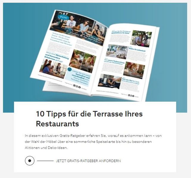 Auch können Gastronomen sich in einem kostenfreien und unverbindlichen Gespräch mit einem der DUNI Experten für den individuellen Bedarf beraten lassen. „Natürlich bieten wir einerseits überzeugende Produkte für die Gastronomie an, die besonders jetzt im Sommer und im Outdoorbereich für eine tolle Stimmung sorgen. Wir sind andererseits jedoch auch Entscheidungshelfer, sehen uns als Berater und Begleiter der Gastronomien. Wir wollen sie unterstützen, aus ihrem individuellen gastronomischen Angebot für sich nachhaltig und langfristig das meiste rauszuholen.“, so Gelhot weiter.