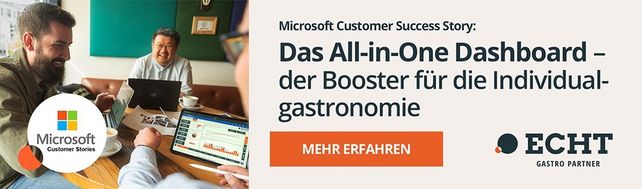 Aus den vielen am Markt angebotenen Systemen ist eines hervorgestochen, weil es eine besonders anschauliche Visualisierung des papierlosen Büros bietet. Das von Microsoft ausgezeichnete ECHT Dashboard erlaubt eine schnelle Übersicht über die wichtigsten Daten und unterstützt bei der Interpretation: Wo muss ich im Einkauf gegensteuern, weil Waren deutlich teurer geworden sind? Welches Team macht den höchsten Umsatz? Wo ist noch Luft nach oben? Welche Gerichte bringen den größten Gewinn und wo zahle ich vielleicht drauf? Alles Fragen, die durch digitale Prozesse zu beantworten sind und die Abläufe im Betrieb schnell und nachhaltig verbessern. Das zahlt sich am Ende in barer Münze aus.