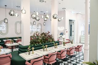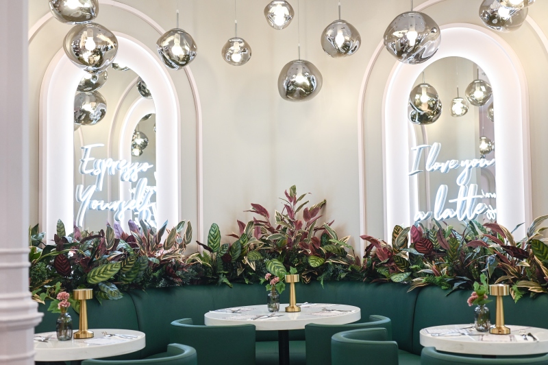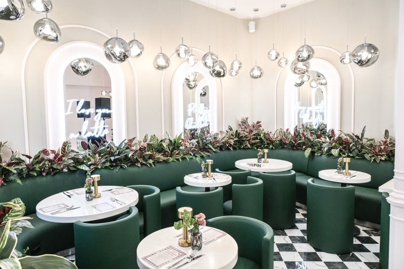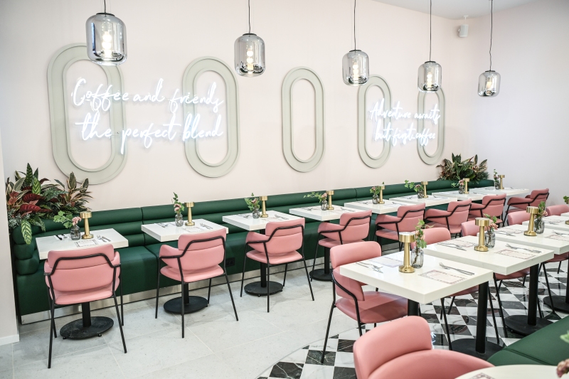 Das Ladenlokal auf einer Fläche von rund 160 Quadratmetern bietet 64 Plätzen im Innen- und 40 Plätzen im Außenbereich. Das Design der Räume setzt auf hellrosa und grünen Möbeln, Lampen und Lichtinstallationen sowie einer üppigen floralen Dekoration