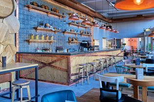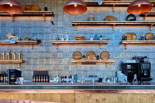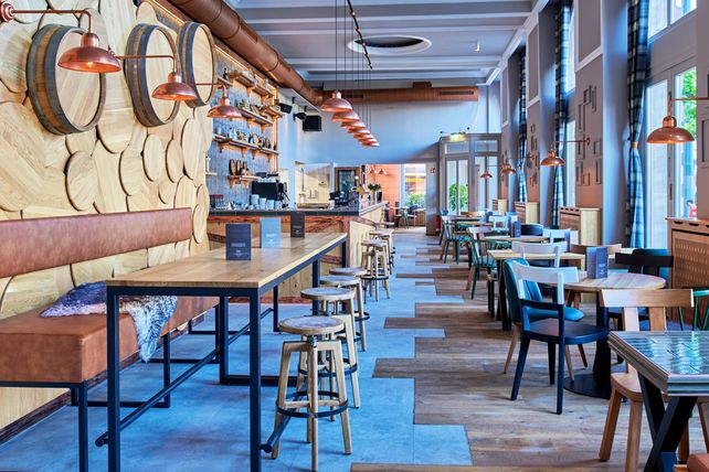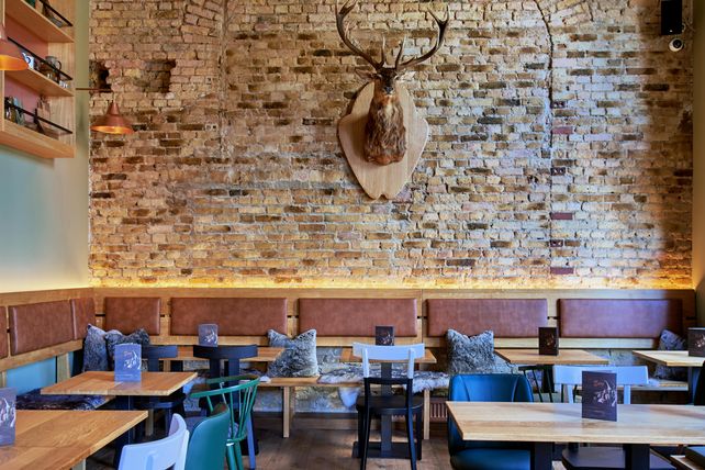 Das Interieur ist modern gestaltet und mit klassischen Gasthaus-Elementen kombiniert. Fliesen, wie man sie aus belgischen Brauereien kennt, kupferfarbene Schindeln, die einen ganzen Raum auskleiden, freigelegte Ziegelwände, schwere Vorhänge.