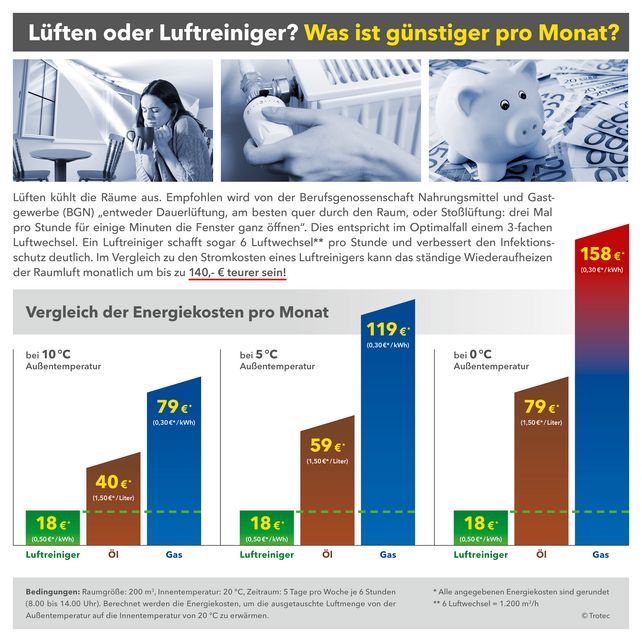 Die kalte Jahreszeit steht bevor und extrem hohe Energiepreise sorgen für Existenzängste. Zugleich prognostizieren Virologen für Herbst und Winter ansteigende Corona-Infektionszahlen. Innenräume müssen damit wieder regelmäßig gelüftet werden, um das Ansteckungsrisiko in der Gastronomie und Hotellerie zu reduzieren. Die Berufsgenossenschaft Nahrungsmittel und Gastgewerbe (BGN) empfiehlt deshalb „entweder Dauerlüftung, am besten quer durch den Raum, oder Stoßlüftung: drei Mal pro Stunde für einige Minuten die Fenster ganz öffnen.“ Der Nebeneffekt: Derart gelüftete Räume müssen umso kostenintensiver wieder beheizt werden. Moderne Luftreiniger von Trotec mildern die Auswirkungen dieser Heizkostenfalle bei gleichzeitigem Infektionsschutz deutlich ab.
