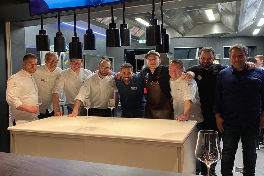 Für das leibliche Wohl der Gäste sorgten mehrere Mitglieder der Jeunes Restaurateurs (JRE). Jockl Kaiser (Wirtshaus Meyers Keller, Nördlingen), Philipp Wolter (PHOENIX Restaurant & Bar, Düsseldorf), Oliver Röder (Burg Flamersheim, Euskirchen), Christian Mittermeier (Villa Mittermeier, Rothenburg ob der Tauber) und Steffen Disch (Raben Horben, Horben) waren angereist, um ihren Kollegen Alexander Wulf zu unterstützen.