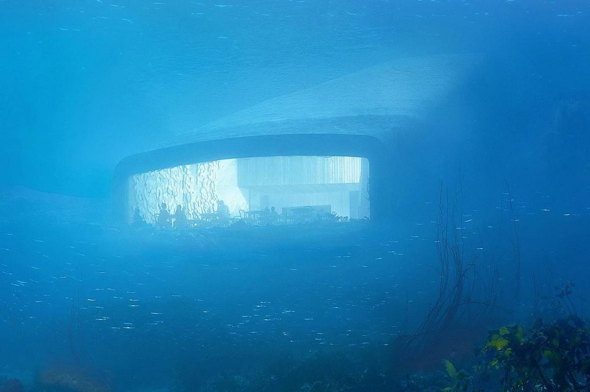 Das 34 Meter lange Gebäude in Form eines Monolithen, das von Norwegens wohl renommiertestem Architekturbüro Snøhetta entworfen wurde, ist halb im Meer versunken und ruht fünf Meter unter der Wasseroberfläche direkt auf dem Meeresboden. Dabei dient die Betonschale des Gebäudes schon jetzt als künstliches Riff, das Napfschnecken und Seetang eine neue Heimat bietet.