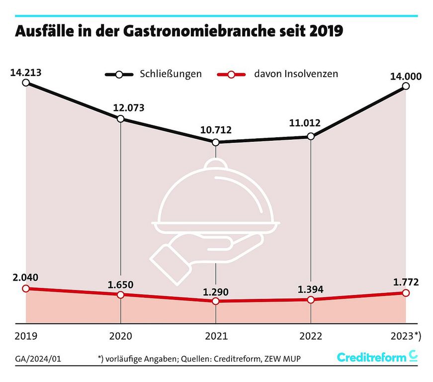 In den Jahren 2020 bis 2023 haben in der Gastronomie bundesweit rund 48.000 Betriebe geschlossen. Für 6.100 Betriebe kam in dieser Zeit das Aus durch eine Insolvenz. Allein 2023 hat etwa jedes zehnte Gastronomieunternehmen aufgegeben.