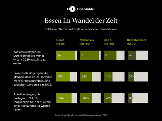 Für 62 Prozent der Deutschen wird der Gang ins Restaurant 2026 eher ein besonderes Erlebnis sein, wohingegen nur 28 Prozent dies als regelmäßige Gewohnheit betrachten. Trotz dieser Verschiebung in der Wahrnehmung bleibt der Restaurantbesuch im Trend: Die Zahl der Besuche in Deutschland stieg laut OpenTable-Daten im Vergleich zum Vorjahr um 5 Prozent.