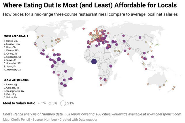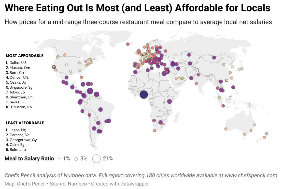 Der Preis für einen Restaurantbesuch ist relativ – er hängt stark davon ab, wo man sich befindet, in welcher Art von Restaurant man isst und wie hoch das verfügbare Einkommen ist. Eine Analyse von Chef’s Pencil beleuchtet, in welchen Städten der Welt das Essen im Restaurant für die lokale Bevölkerung am erschwinglichsten ist. Die Untersuchung vergleicht die Restaurantpreise mit den lokalen Löhnen in über 170 Städten weltweit.