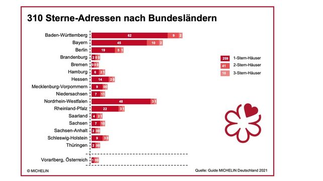 Nach wie vor drei Sterne schmücken auch das Restaurant «Bareiss» in Baiersbronn. Dass zwei Top-Adressen in einem Bundesland liegen, ist unter den zehn derart dekorierten Häusern nur noch in Bayern der Fall. 9 der 41 Restaurants mit zwei Sternen liegen zudem im Südwesten sowie 62 der 259 Restaurants mit einem Stern. Neu in der letzten Kategorie sind auch das Gourmetrestaurant «fine dining RS» in Salach (Landkreis Göppingen) und das Restaurant «Schwarzer Adler» in Vogtsburg im Kaiserstuhl (Landkreis Breisgau-Hochschwarzwald).