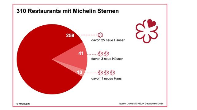 25 Restaurants dürfen sich im diesjährigen Guide über die neue Auszeichnung mit einem Michelin-Stern freuen. Verteilt sind sie über das ganze Land, von Usedom bis Berchtesgaden. Damit gibt es in der Ausgabe 2021 insgesamt 259 Ein-Sterne-Häuser.