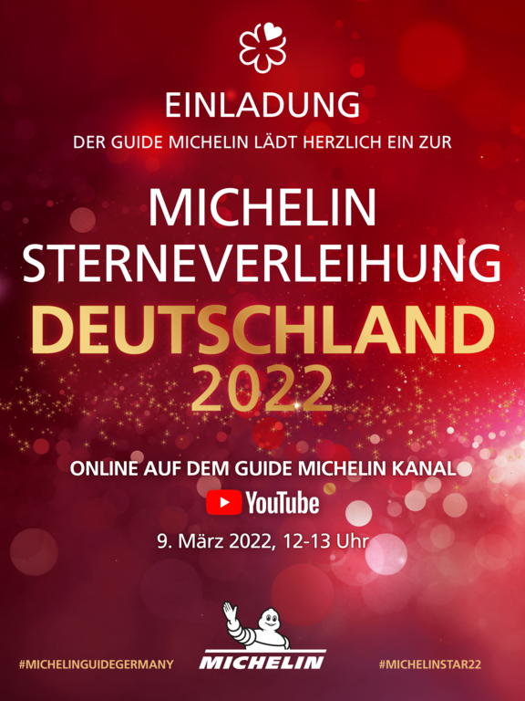Am 9. März um 12.00 Uhr gibt der Guide Michelin Deutschland seine Auszeichnungen für 2022 in der Handelskammer Hamburg bekannt. Eine Auswahl an Restaurants mit hohem gastronomischem Niveau erhalten einen oder mehrere Sterne, einen „Bib Gourmand“ oder den „Grünen Stern“.
