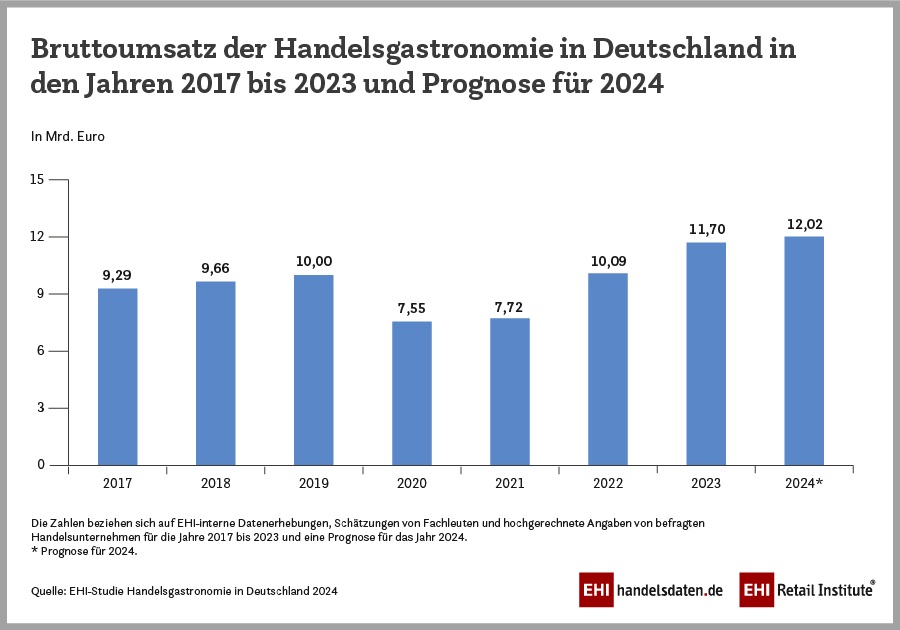 „Das ist trotz Inflation ein außergewöhnliches Wachstum von 15,9 Prozent im Vergleich zum Vorjahr. Dennoch müssen sich die Händler weiterhin den bekannten Herausforderungen stellen“, erklärt Olaf Hohmann, Autor der EHI-Studie „Handelsgastronomie in Deutschland 2024“, die in Kooperation mit der GfK entstanden ist. Die Prognose für das laufende Jahr 2024 liegt mit 12 Mrd. Euro Umsatz noch höher.