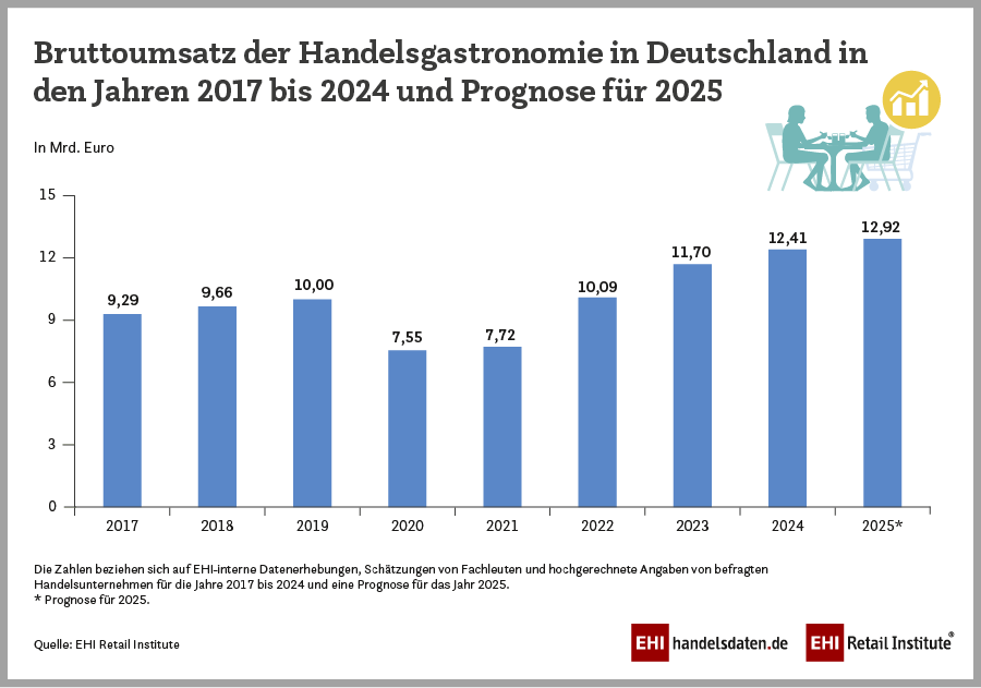 Trotz des verhaltenen Konsumklimas in Deutschland bleibt die Handelsgastronomie weiter auf Wachstumskurs. Laut der aktuellen EHI-Befragung konnten die Händler ihren gastronomischen Umsatz im Jahr 2024 durchschnittlich um 6,1 Prozent steigern. Der Gesamtumsatz erreichte damit ein Rekordniveau von 12,41 Mrd. Euro (2023: 11,70 Milliarden Euro).