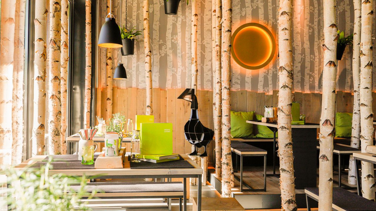 Im Innenraum finden über 190 Gäste Platz. An sonnigen und warmen Tagen bietet der Außenbereich Platz für weitere 150 Gäste. Wer auf dem Sprung ist, kann sein Menü an der Ausgabe abholen.
