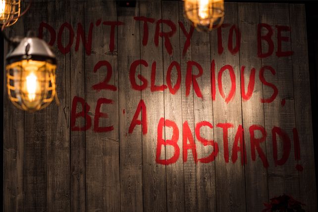 „Don’t try to be 2 glorious, be a bastard”: Unübersehbar an die Wand gepinselt spiegelt dieser Schriftzug auch das Ambiente aus unverputzten Ziegelmauern, und alten Fliesen wieder. Used Look und Vintage-Style - nicht billig nachgemacht, sondern aus hochwertigen Originalen stilvoll zusammengestellt.