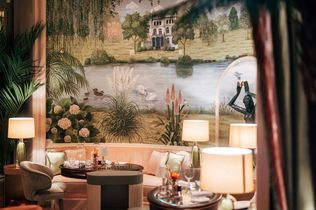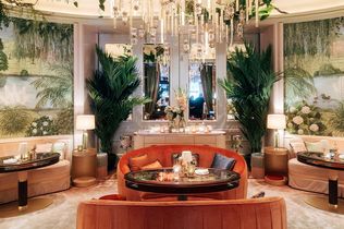 Im Restaurant schaffen kaukasischer Nussbaum, warme Farben wie Rostrot, Olivgrün und Taubenblau zusammen mit einem Kaminfeuer eine elegante und wohnliche Atmosphäre. Gleichzeitig präsentiert sich der benachbarte Ovale Salon als strahlend heller Raum in zarten Pastelltönen eine bewusste Neugestaltung im Sinne Fahrenkamps. Ein faszinierender Kontrast zum gesamten GRILL .