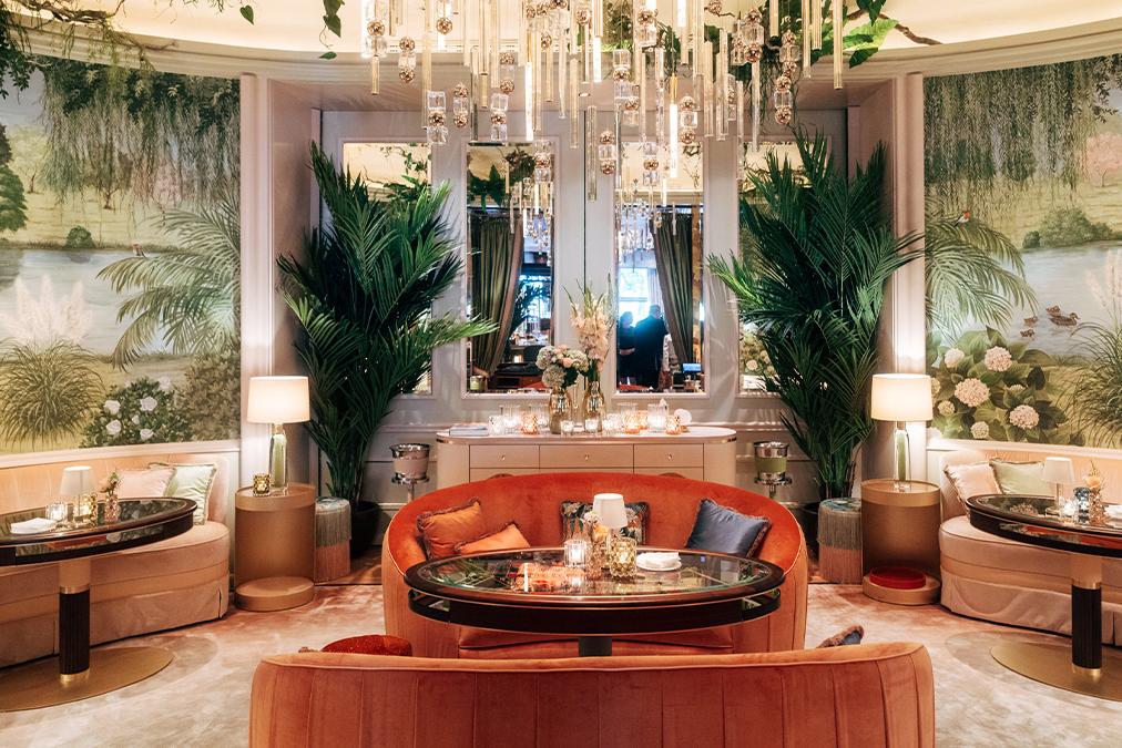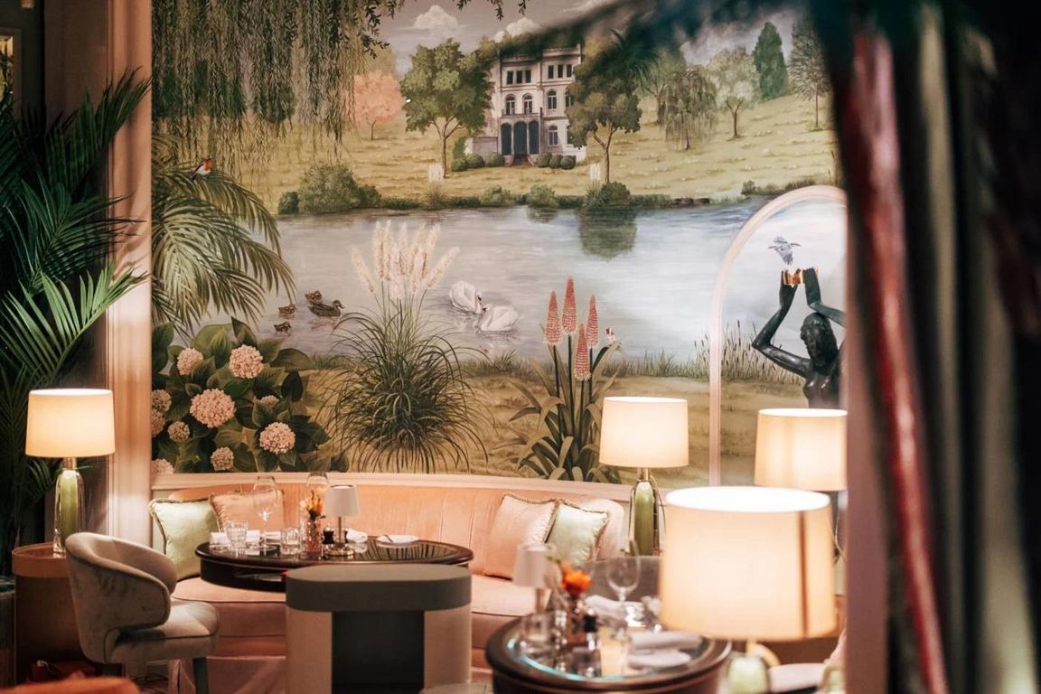 Eine umlaufende Wandmalerei im Ovalen Salon entführt die Gäste in eine fantastische Welt, die vom Hamburger Feenteich inspiriert ist und eine mannigfaltige reichhaltige Vegetation mit urbanen Stadtvillen und naturverbundenen Landschaftsgärten zeigt. Exotische Pflanzen aus fernen Ländern fügen sich harmonisch in das Gesamtbild ein. Der Blick schweift über Wasser, alte Bäume, Hortensien, Rhododendren, edle Rosensorten, Schilf und Seegras. Es entsteht eine faszinierende Kulisse, die den Besucher in die Welt der Wintergärten, Gewächshäuser, Gartenpavillons und Teehäuser versetzt. Der Ovale Salon lädt als exklusiver Ort zum Verweilen ein, wo historische Brettspiele zur Entspannung und gehobenem Zeitvertreib einladen.