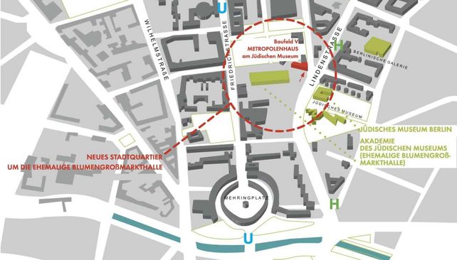 Wir befinden uns auf dem Areal des ehemaligen Blumengroßmarkts der Hauptstadt auf dem Fromet-und-Moses-Mendelssohn-Platz: Das METROPOLENHAUS am Jüdischen Museum wurde 2017 fertig gestellt und erhielt mehrere Auszeichnungen, u.a. ist es Gewinner des Deutschen Städtebaupreises 2020. Es ist konzipiert als „interkulturelles Mosaik“ mit Wohnungen, Büros, großflächigen Veranstaltungsräumen, Ladengeschäften und Gastronomie.