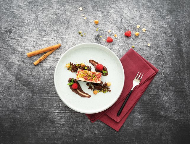 - Neuheit: Mandelnougat mit Zwetschge auf Nussboden, zartschmelzende Mandelnougatmousse mit Dulcey Schokolade und fruchtigem Zwetschgen-Spiegel