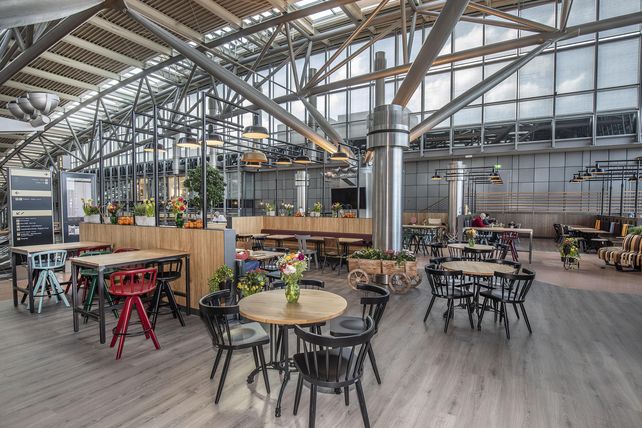 Das Design des neuen Marché Mövenpick Restaurants soll an einen lebendigen und kunterbunten Marktplatz erinnern: natürliches Mobiliar aus Holz und moderne, farbige Betonfliesen setzen urbane Akzente. Mit 216 Sitzplätzen bietet das Marché Mövenpick ausreichend Platz für die ganze Familie. Für die kleinen Gäste gibt es eine neu ausgestattete Kinderecke mit Brio-Spieltisch, kleinem Marktstand, Maltisch sowie einer Rutsche.