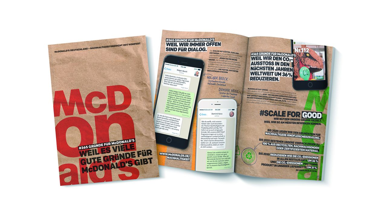 Bis 2030 will McDonald’s so viel CO2 einsparen, wie 32 Millionen Autos innerhalb eines Jahres ausstoßen. Dies teilte das Unternehmen nun im jährlichen Nachhaltigkeitsbericht mit. Bereits zum achten Mal dokumentiert der Burgerbrater damit die Daten, Fakten und Fortschritte im Hinblick auf die Herkunft der Rohwaren, die Gestaltung der Lieferkette oder ein nachhaltiges Energie- und Verpackungsmanagement für das Geschäftsjahr 2017. Die Aufmachung des Berichts ist dabei an die diesjährige Kampagne „365 Gründe für McDonald's" angelehnt, mit der das Unternehmen auf seinen Social-Media-Kanälen jeden Tag einen Grund für einen Besuch bei McDonald's präsentiert. Jedes Kapitel wird dabei mit einem dieser Gründe eröffnet und dieser genauer erläutert.