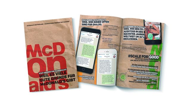 Eine zentrale Rolle spielt im aktuellen Bericht die globale Nachhaltigkeitsstrategie „Scale for Good", mit der sich McDonald's ambitionierte Ziele gesetzt hat. Weltweit will McDonald's beispielsweise bis 2030 in den Restaurants und Büros die CO2-Emissionen um 36 Prozent, in der Lieferkette um 31 Prozent pro Tonne Produkt senken. Das entspricht einer Menge von 150 Millionen Tonnen CO2. Im Verpackungsbereich sollen bis 2025 weltweit alle Verpackungen zu 100 Prozent aus recycelten, erneuerbaren oder zertifizierten Materialien bestehen und unsere Verkaufsverpackungen zu 100 Prozent recycelt werden.