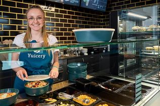 Auch Behältnisse, die von den Kunden selbst mitgebracht werden, sollten an einer bestimmten und dafür geeigneten Stelle befüllt werden. Hier sollten Sie darauf achten, dass möglichst wenig Berührungspunkte entstehen. Im Idealfall müssen Mitarbeitende die Behältnisse nicht berühren, wenn Kunden den Deckel bzw. Verschluss selbst öffnen und wieder schließen – falls nötig, können die Behältnisse zum Befüllen auf ein Tablett gestellt werden. Sollten selbst mitgebrachte Behältnisse erkennbar verschmutzt oder nicht geeignet sein, sollten Sie diese ablehnen und können Alternativen wie ihr eigene Mehrweglösung oder Einwegverpackungen anbieten. Denn als Gastronom:in müssen Sie dafür sorgen, dass Keime oder Verschmutzungen aus Fremdgefäßen das eigene Arbeitsumfeld nicht verunreinigen.