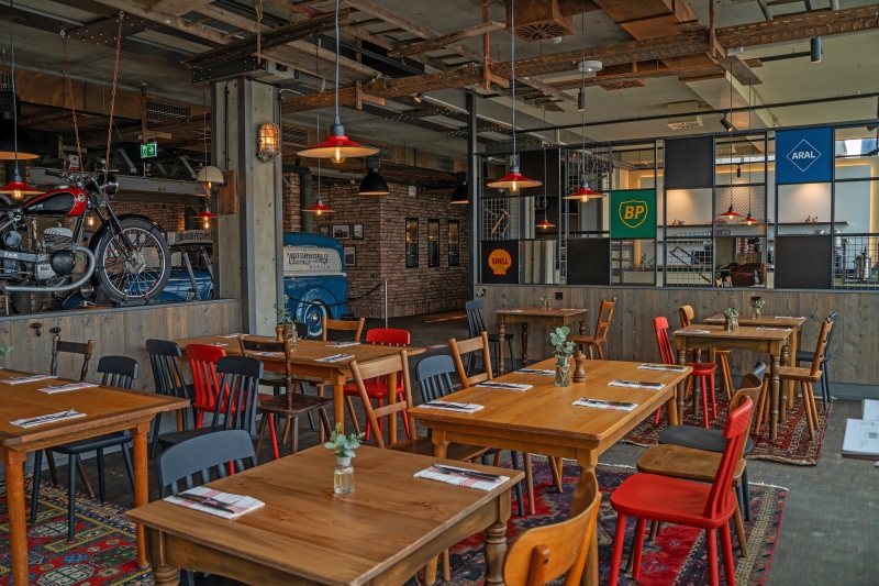 Das Motorworld Inn Restaurant ist laut Mitteilung im Stil einer historischen Werkstatt gestaltet und mit Objekten aus der Automobilgeschichte ausgestattet. Dazu zählen unter anderem eine Sitzgruppe unter einer Hebebühne sowie ein an der Decke montiertes Fahrzeugmodell.