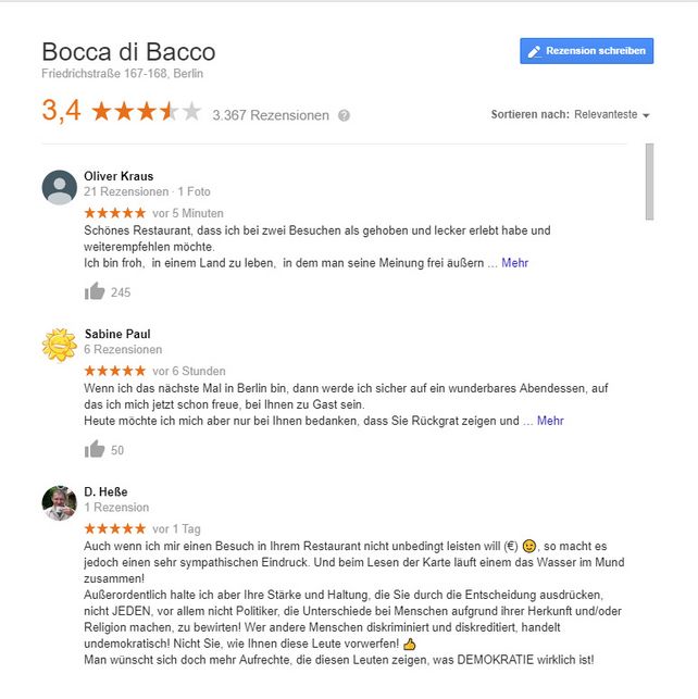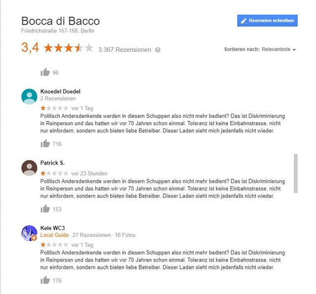 Das Restaurant Bocca di Bacco in Berlin Mitte hat sich geweigert, die Parteispitze der AfD zu bewirten (Tageskarte berichtete). Das wollte Fraktionssprecher Christian Lüth nicht auf sich sitzen lassen und nannte die Entscheidung in einem Tweet „undemokratisch und dumm“. Auf den Tweet folgte schnell die digitale Mobilmachung der AfD-Anhänger, die seitdem mit schlechten Google-Bewertungen um sich werfen. Besonders kreativ gehen diese dabei allerdings nicht vor, was an vielen identischen Beiträgen zu erkennen ist: „Politisch Andersdenkende werden in diesem Schuppen also nicht mehr bedient? (…) Das ist Diskriminierung in Reinperson (sic).“